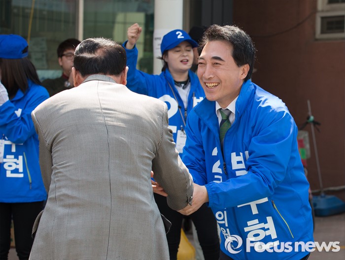 (공주=포커스뉴스) 1일 충남 공주시 산성시장 일원에서 박수현 더불어민주당 후보가 지지를 호소하고 있다.