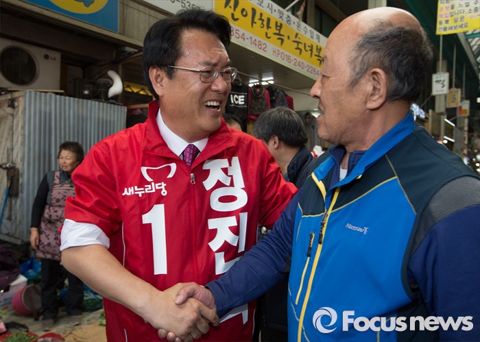(공주=포커스뉴스) 1일 충남 공주시 산성시장 일원에서 정진석 새누리당 후보가 지지를 호소하고 있다.