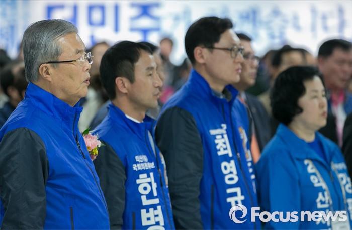 (익산=포커스뉴스) 김종인 더불어민주당 비대위 대표 겸 선대위원장 등 내빈들이 1일 오후 한병도 전북 익산을 후보 선거사무소에서 열린 개소식에 참석해 애국가를 부르고 있다. 왼쪽부터 김 대표, 한 후보, 최영규 도의원 후보, 강팔문 익산시장 후보 부인.