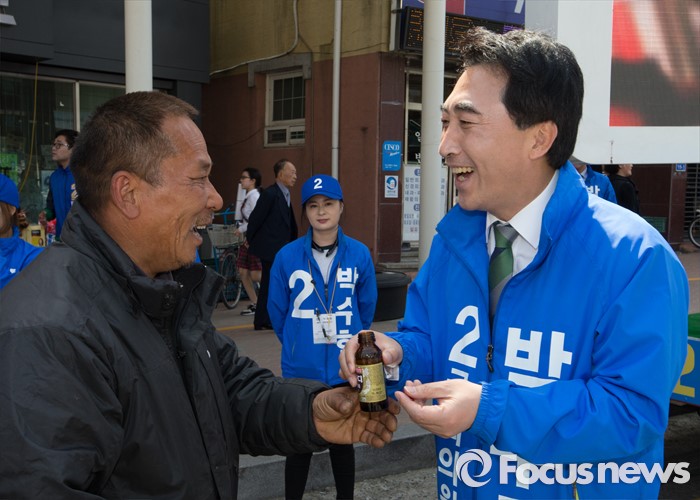 (공주=포커스뉴스) 1일 충남 공주시 산성시장 일원에서 박수현 더불어민주당 후보가 시민으로부터 영양제와 음료를 받고 있다.