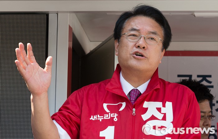 (공주=포커스뉴스) 1일 충남 공주시 산성시장 일원에서 정진석 새누리당 후보가 지지를 호소하고 있다.
