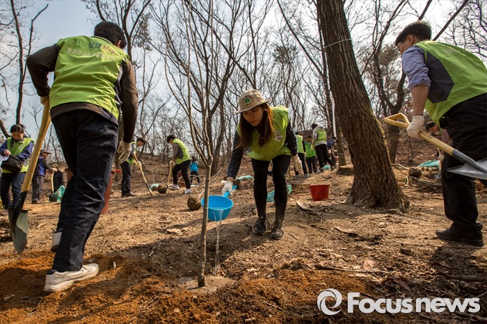 (서울=포커스뉴스) 1일 오후 서울 동대문구 배봉산에서 동대문구청 직원들이 식목일을 앞두고 나무를 심고 있다.