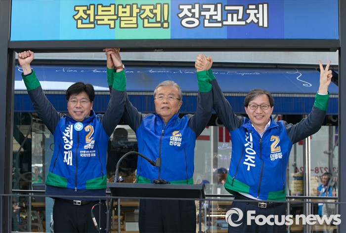 김 대표는 이날 오전 11시 덕진구 모래내시장에서 열린 김윤덕(전주갑)·최형재(전주을)·김성주(전주병) 후보의 합동 선거운동 자리에서 후보 한 명 한 명을 언급하며 지지를 호소했다.
