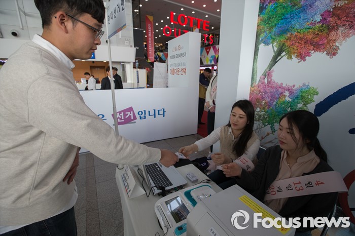 (서울=포커스뉴스) 1일 오후 서울 용산구 서울역사에 설치된 제20대 국회의원선거 투표참여 홍보관에서 시민들이 사전투표 체험을 하고 있다. 체험관은 이달 1일부터 6일까지 운영한다.
