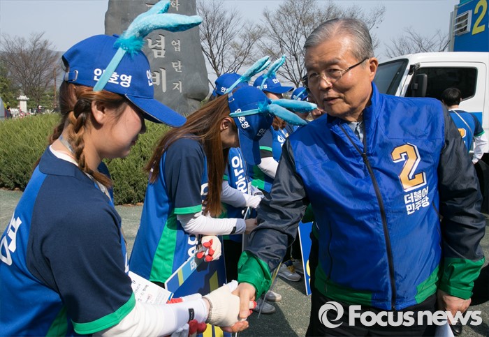 (완주=포커스뉴스) 1일 오후 전북 완주군 둔산공원 앞 사거리에서 김종인 더불어민주당 비대위 대표 겸 선대위원장이 안호영 완주·진안·무주·장수군 후보의 선거운동원들을 격려하고 있다.