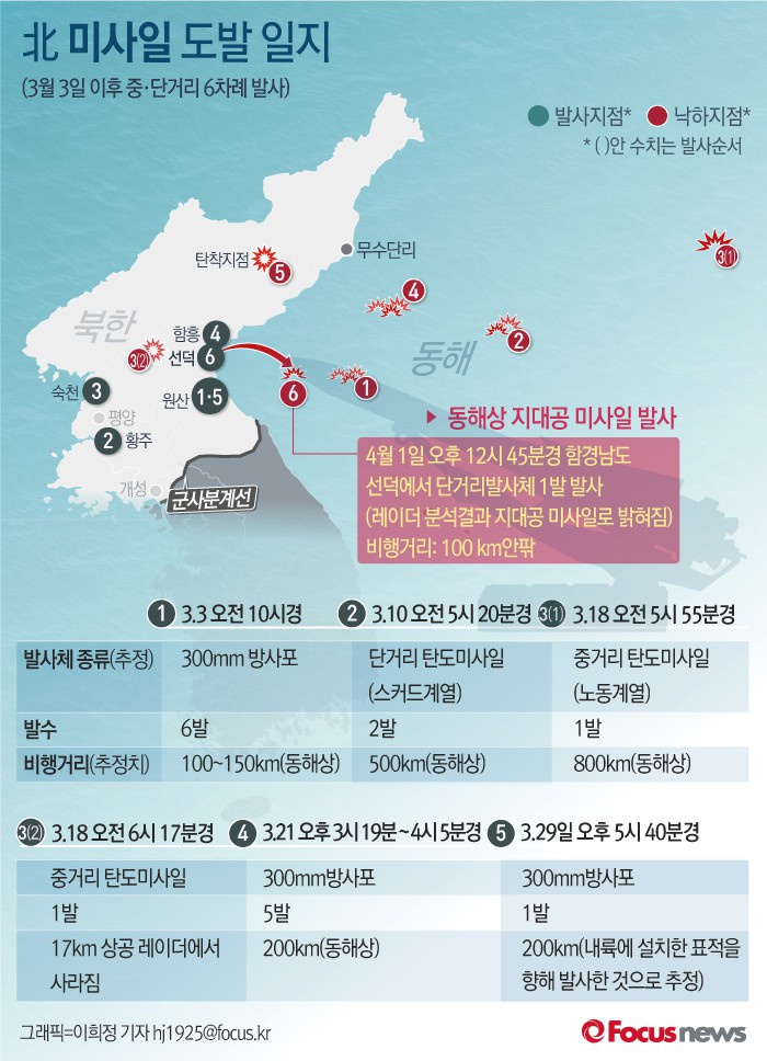 (서울=포커스뉴스) 합동참모본부는 "1일 낮 12시 45분 쯤 북한이 함경남도 선덕 일대에서 동해상으로 단거리 지대공 미사일 1발을 발사했다"고 밝혔다. 북한은 그 동안 방사포와 중·단거리 탄도미사일을 발사했으며, 지대공 미사일을 발사한 것은 올해 들어 이번이 처음이다.