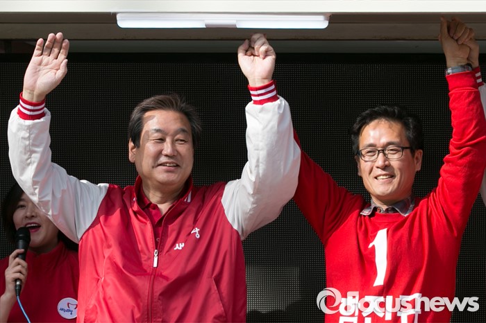 (시흥=포커스뉴스) 김무성(왼쪽) 새누리당 대표가 1일 오후 경기도 시흥시 삼미시장 입구에서 열린 함진규 시흥갑 후보 지원 유세에 참석해, 함 후보와 손을 들고 있다.