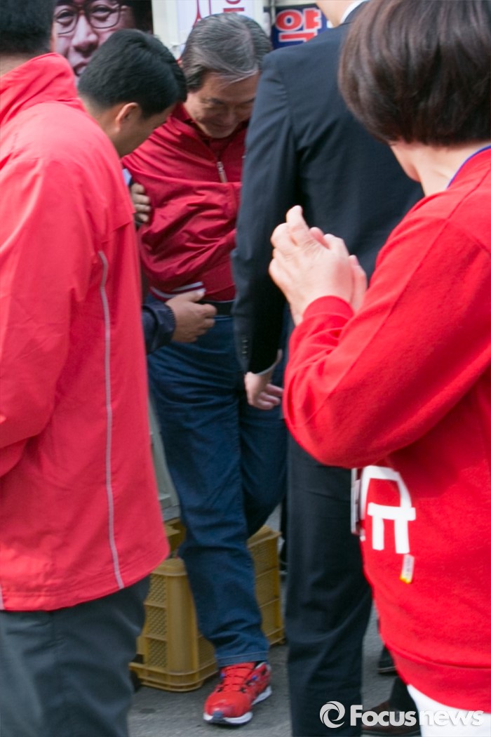 (시흥=포커스뉴스) 김무성 새누리당 대표가 1일 오후 경기도 시흥시 삼미시장 입구에서 함진규 시흥갑 후보 지원 유세를 마친 뒤, 유세차량을 내려오던 중 발판이 깨져 발이 깨진 발판상자 빠져있다.