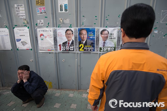 (인천=포커스뉴스) 안철수 국민의당 상임공동대표가 1일 오후 인천시 부평구 부평 4동에서 문병호 부평구갑 후보 지원 유세를 하고있는 가운데 한 유권자가 벽에 붙은 선거포스터를 보고 있다.