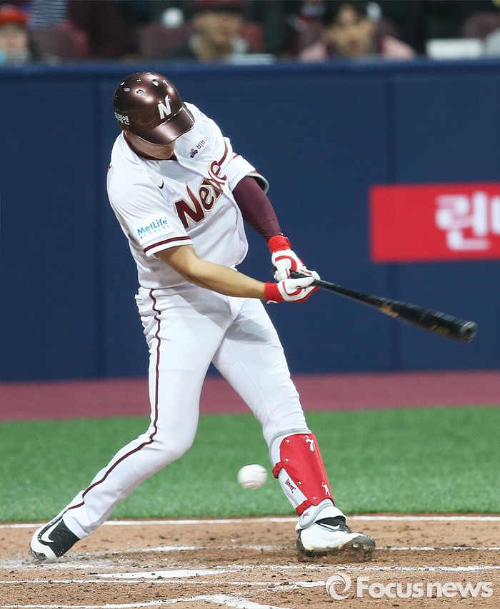 (서울=포커스뉴스) 1일 오후 서울 구로구 고척스카이돔에서 열린 2016 타이어뱅크 프로야구 개막전 넥센 히어로즈와 롯데 자이언츠의 경기 2회말 1사 2,3루 상황 넥센 김하성이 헛스윙을 하고 있다.