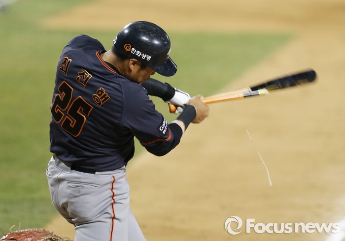 (서울=포커스뉴스) 1일 서울 잠실구장에서 열린 2016프로야구 개막전 한화-LG 경기5회초 1사 1,3루에서 한화 최진행이 2루 땅볼을 날리고 있다. 배트가 부러지며 조각이 날아가고 있다.