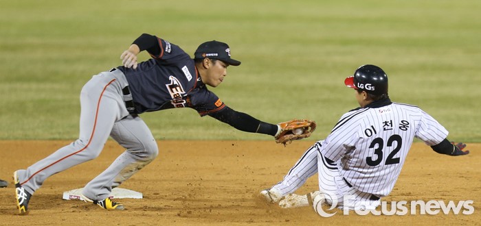 (서울=포커스뉴스) 1일 서울 잠실구장에서 열린 2016프로야구 개막전 한화-LG 경기에서 5회말 2사 1,3루에서 더블스틸을 시도한 LG 1루주자 이천웅을 한화 2루수 정근우가 태그하고 있다.