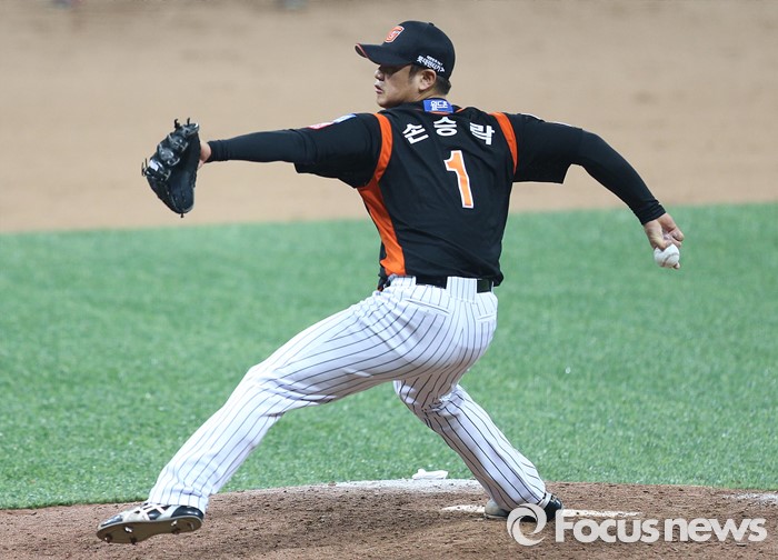 (서울=포커스뉴스) 1일 오후 서울 구로구 고척스카이돔에서 열린 2016 타이어뱅크 프로야구 개막전 넥센 히어로즈와 롯데 자이언츠의 경기 9회말 롯데 마무리 투수 손승락이 투구하고 있다.
