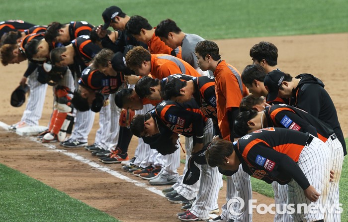 승리 후 팬들에게 인사하는 롯데 선수들