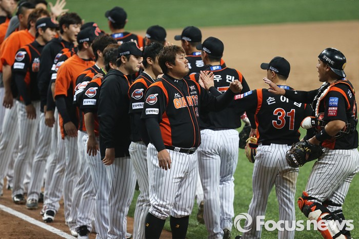 (서울=포커스뉴스) 1일 오후 서울 구로구 고척스카이돔에서 열린 2016 타이어뱅크 프로야구 개막전 넥센 히어로즈와 롯데 자이언츠의 경기에서 롯데가 2:1로 승리한 후 하이파이브 하고 있다.