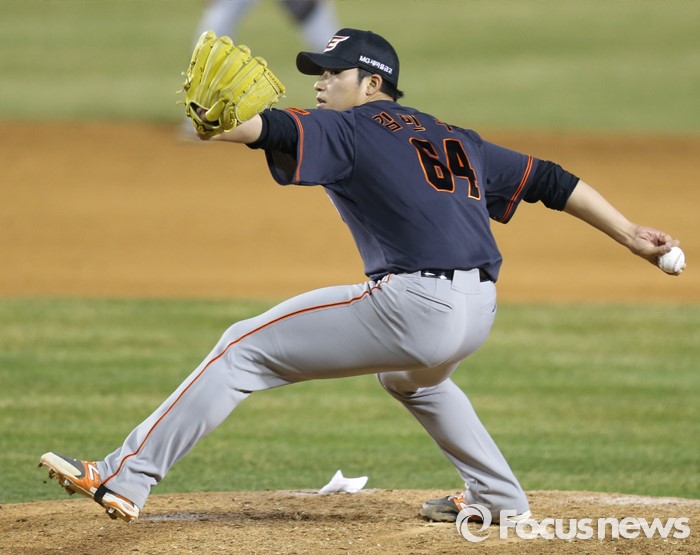 (서울=포커스뉴스) 1일 서울 잠실구장에서 열린 2016프로야구 개막전 한화-LG 경기에서 한화 투수 김민우가 연장 12회말에 투구하고 있다.