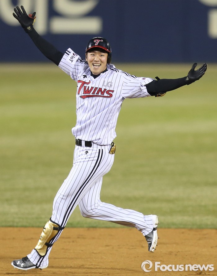 (서울=포커스뉴스) 1일 서울 잠실구장에서 열린 2016프로야구 개막전 한화-LG 경기 연장 12회말 1사 2루에서 좌익수를 넘기는 역전 2루타를 날린 LG 양석환이 환호하고 있다.