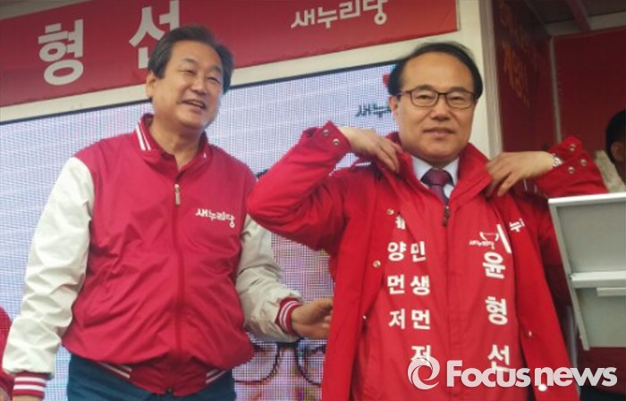 (인천=포커스뉴스) 김무성(왼쪽) 새누리당 대표가 2일 오전 인천 계양구 병방시장 입구에서 열린 윤형선 계양을 후보 지원 유세에 참석해 윤 후보에게 옷을 입혀주고 있다.