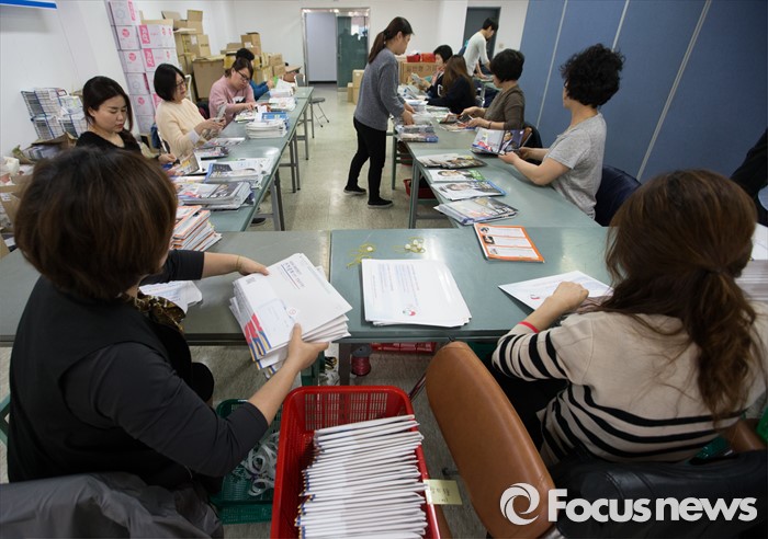 (서울=포커스뉴스) 2일 오후 서울 성북구 선거관리위원회에서 관계자들이 가정으로 발송될 제20대 국회의원 선거 공보물을 정리하고 있다.