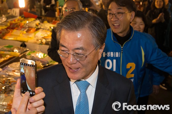 (서울=포커스뉴스) 선거운동이 시작되고 첫 주말을 맞은 3일 오후 문재인 전 더불어민주당 대표가 서울 중구 중앙시장에서 이지수 더불어민주당 중구 성동을 후보와 합동유세를 하고 있다.
