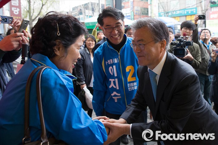 (서울=포커스뉴스) 선거운동이 시작되고 첫 주말을 맞은 3일 오후 문재인 전 더불어민주당 대표가 서울 중구 중앙시장에서 이지수 더불어민주당 중구 성동을 후보와 합동유세를 하고 있다.