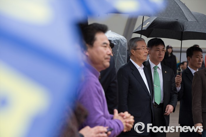 (서울=포커스뉴스) 3일 오후 서울 강서구 방화근린공원 일대에서 김종인 더불어민주당 비대위 대표 겸 선대위원장이 진성준 강서을 후보와 함께 유세를 하고 있다.