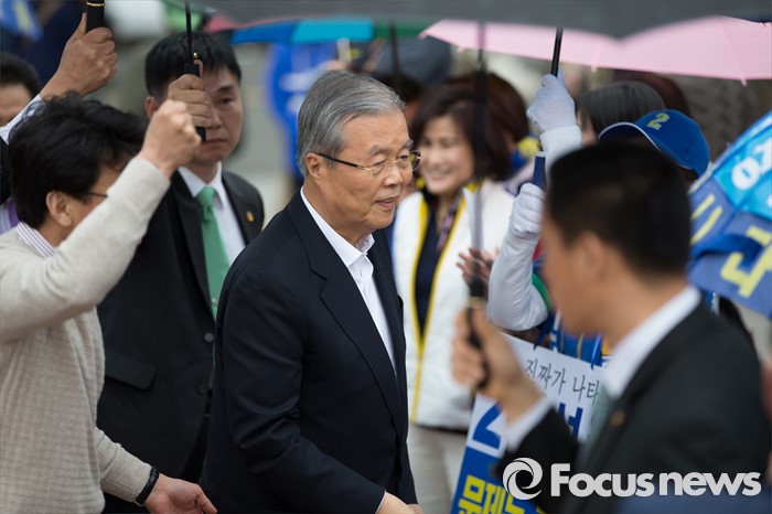 (서울=포커스뉴스) 3일 오후 서울 강서구 방화근린공원 일대에서 김종인 더불어민주당 비대위 대표 겸 선대위원장이 진성준 강서을 후보와 함께 유세를 하고 있다.