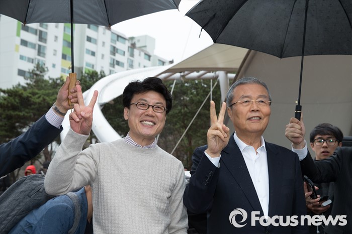(서울=포커스뉴스) 3일 오후 서울 강서구 방화근린공원 일대에서 김종인 더불어민주당 비대위 대표 겸 선대위원장이 진성준 강서을 후보와 함께 유세를 하고 있다.
