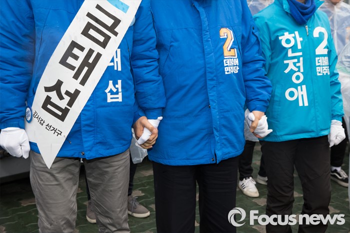 (서울=포커스뉴스) 3일 오후 서울 강서구 화곡역 사거리에서 김종인 더불어민주당 비대위 대표 겸 선대위원장이 강서갑 금태섭, 강서병 한정애 후보와 함께 유세를 하고 있다.