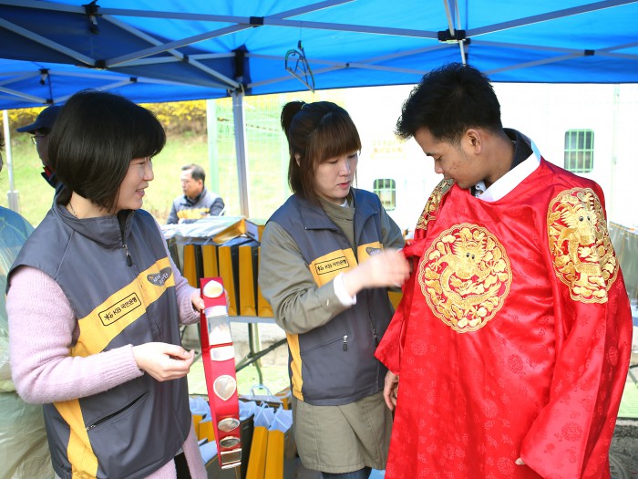 이날 국민은행은 이동점포 운영을 통해 평일 은행 이용이 어려운 외국인근로자들에게 통장신규, 해외송금안내 등의 금융서비스를 함께 제공했다.KB국민은행은 지난 3일 경기도 군포시민광장에서 구세군, 열린의사회와 함께 'KB국민은행 외국인근로자 한국문화축제'를 개최했다. 사진은 외국인 노동자가 한국문화를 체험하는 모습.<사진제공=KB국민은행>