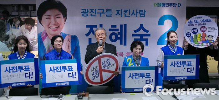 (서울=포커스뉴스) 4일 오전 전혜숙 더불어민주당 서울 광진갑 후보 선거사무소에서 중앙선거대책위원회의에 앞서 김종인 비대위 대표 겸 선대위원장, 전 후보, 장하나 의원과 비례대표 후보들이 20대 총선 사전투표 독려 캠페인을 하고 있다.