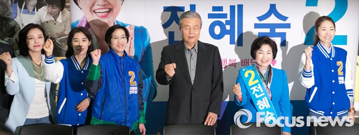 (서울=포커스뉴스) 4일 오전 전혜숙 더불어민주당 서울 광진갑 후보 선거사무소에서 중앙선거대책위원회의에 앞서 김종인 비대위 대표 겸 선대위원장, 전 후보, 장하나 의원과 비례대표 후보들이 20대 총선 사전투표 독려 캠페인을 마친 뒤 구호를 외치고 있다.