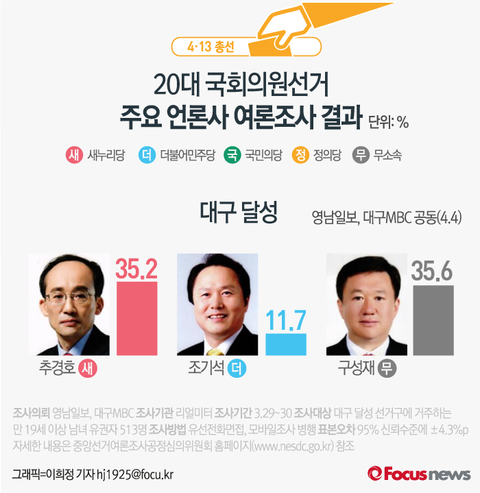 (서울=포커스뉴스) 영남일보, 대구MBC가 리얼미터에 의뢰해 4일 발표한 여론조사 결과에 따르면 새누리당 추경호 후보의 지지율은 35.2%, 더불어민주당 조기석 후보의 지지율은 11.7%, 무소속 구성재 후보는 35.6%를 기록했다.