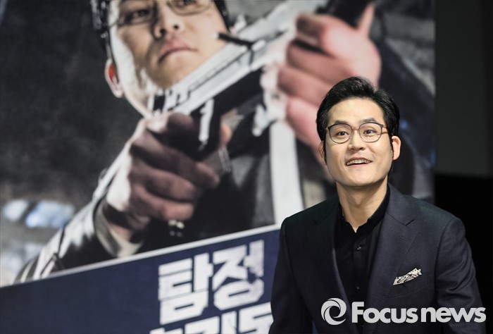 (서울=포커스뉴스) 4일 오전 서울 강남구 압구정 CGV에서 열린 영화 '탐정 홍길동 : 사라진 마을' 제작보고회에 배우 김성균이 참석하고 있다.