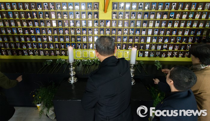 (서울=포커스뉴스) 4일 오전 서울 광화문광장에서 전국교직원노동조합 조합원들이 세월호 참사 2주기 공동수업 및 실천활동 선포 기자회견을 마친 후 세월호 광장 분향소에 헌화하고 있다.