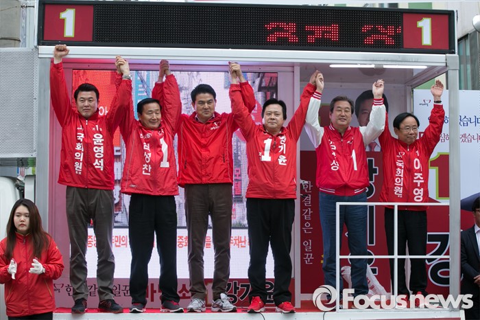 (창원=포커스뉴스) 김무성(오른쪽 두번째) 새누리당 대표와 강기윤(오른쪽 세번째) 창원시성산 후보를 비롯한 참석자들이 4일 오전 경남 창원시 성산구 가음정시장 앞에서 유세를 마친 뒤, 손을 들고 있다.