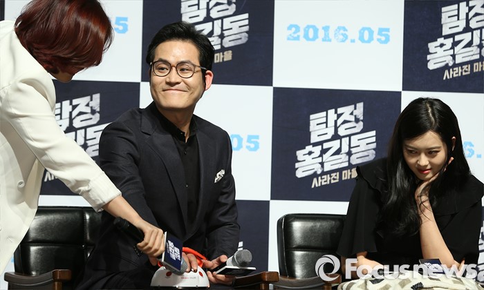 (서울=포커스뉴스) 4일 오전 서울 강남구 압구정 CGV에서 열린 영화 '탐정 홍길동 : 사라진 마을' 제작보고회에 참석한 김성균(가운데)이 거짓말 탐지기를 이용한 질문을 받고 있다.