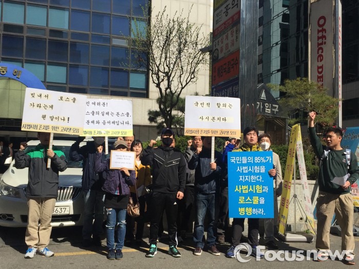 한정훈 사시존치고시생모임 대표는 "더민주당의 전신인 열린우리당은 사법시험을 폐지하고 연평균 등록금이 1500만원에 달하는 로스쿨을 도입하면서 로스쿨에 진학할 수 없는 서민들의 직업선택의 자유, 공무담임권, 평등권 등을 침해했다"고 주장했다.