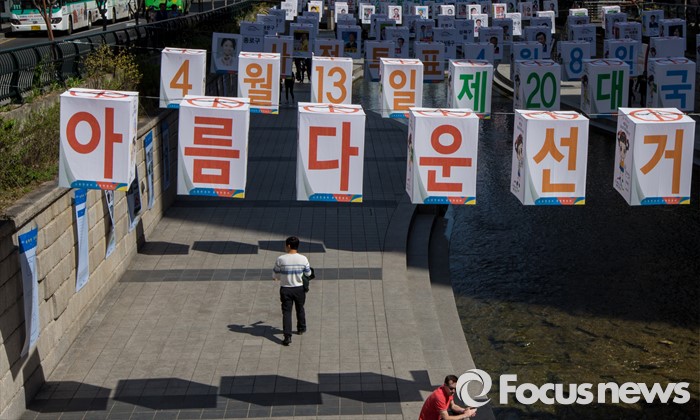 (서울=포커스뉴스) 4일 오후 서울 청계천 모전교에서 광통교 사이에 4.13 제20대 국회의원선거를 알리는 조형물이 설치돼 있다.
