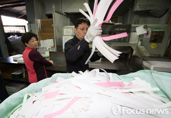 (서울=포커스뉴스) 제20대 국회의원 선거를 9일 앞둔 4일 오후 서울 영등포구 한 인쇄소에서 직원들이 인쇄된 투표용지를 제단하고 있다.