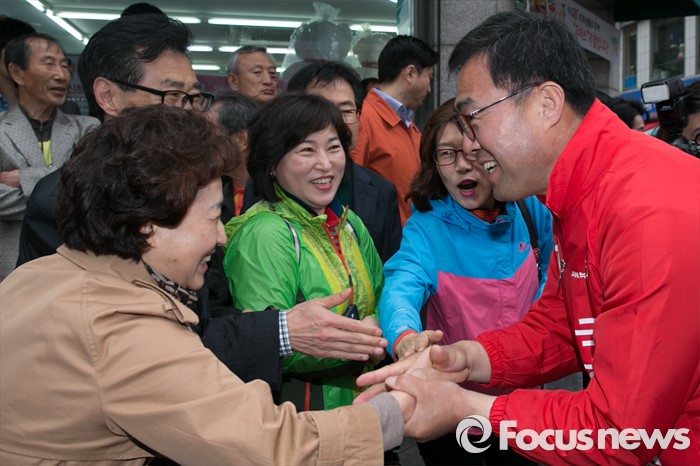 (김해=포커스뉴스) 이만기(오른쪽) 새누리당 김해을 후보가 4일 오후 경남 김해시 내외로 외동전통시장 앞에서 유세를 마친 뒤, 시민들의 손을 잡고 있다.