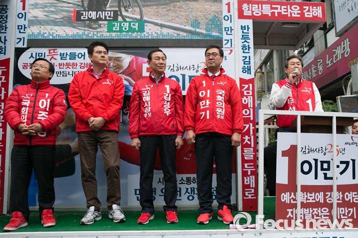 (김해=포커스뉴스) 김무성(오른쪽) 새누리당 대표가 4일 오후 경남 김해시 내외로 외동전통시장 앞에서 이만기(오른쪽 두번째) 김해을 후보 지원유세를 하고 있다.