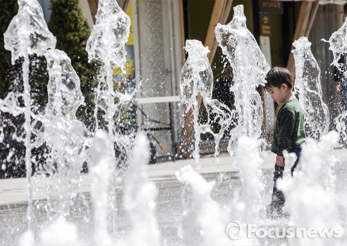 (서울=포커스뉴스) 4일 오후 서울 광화문광장 분수대에서 한 어린이가 물장난을 치고 있다.