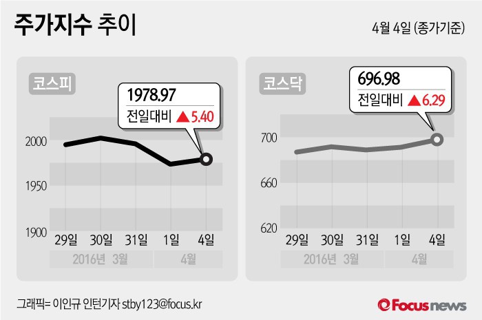 (서울=포커스뉴스) 4일 코스피지수는 전날 보다 0.27%(5.40포인트) 오른 1978.97에 장을 마쳤다. 코스닥지수는 전일 대비 0.91%(6.29포인트) 오른 696.98에 마감했다.
