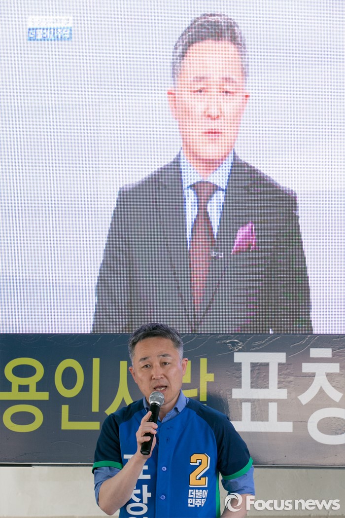(용인=포커스뉴스) 4일 오후 경기도 용인 이마트 죽전점 앞 광장에서 열린 더불어민주당 용인지역 합동유세에 참석한 표창원 용인정 후보가 지지를 호소하고 있다.