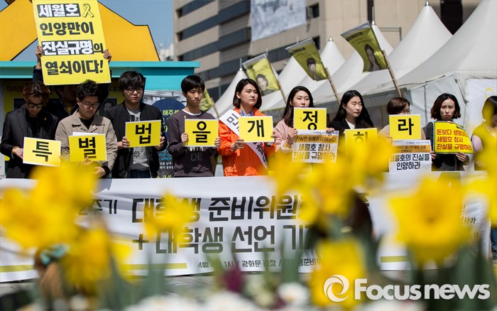 (서울=포커스뉴스) 4일 오후 서울 광화문광장에서 열린 4.16 세월호참사 2주기 대학생 준비위원회 발족식에 참석한 청년들이 특별법 개정을 촉구하는 손팻말을 들고 있다.