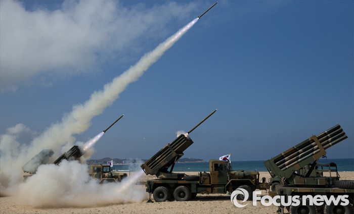 (고성=포커스뉴스) 4일 오후 강원도 고성 송지호해변에서 열린 '2016년 전반기 해상사격 훈련'에서 육군 8군단 포병대대 소속 130mm 다련장 구룡이 로켓탄을 발사하고 있다.