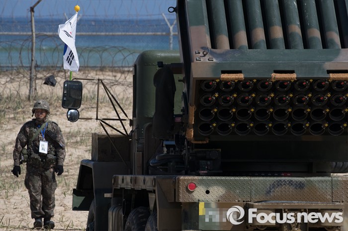 (고성=포커스뉴스) 4일 오후 강원도 고성 송지호해변에서 열린 '2016년 전반기 해상사격 훈련'에서 육군 8군단 포병대대 소속 장병이 130mm 다련장 구룡의 발사 준비를 하고 있다.