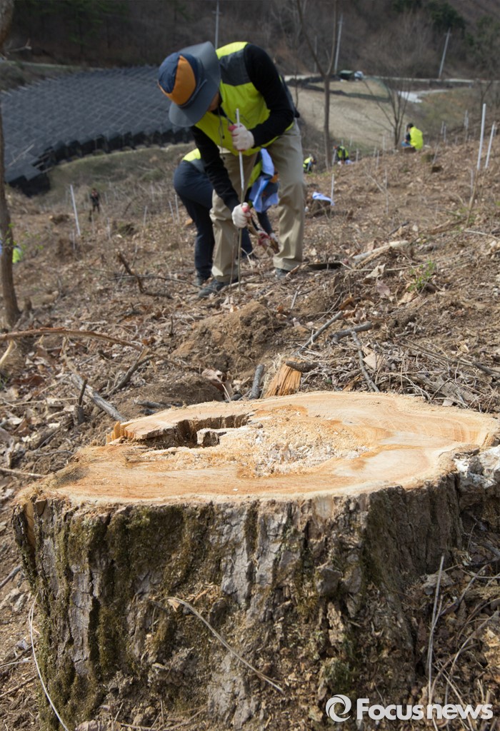 (세종=포커스뉴스) 김경환 국토교통부차관과 직원들이 식목일을 앞두고 4일 오후 세종시 금남면 영곡리 야산에서 나무심기를 하고 있다.