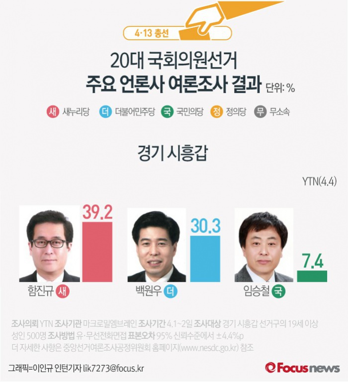 (서울=포커스뉴스) YTN이 여론조사기관 엠브레인에 의뢰해 4일 발표한 결과에 따르면 경기 시흥갑 후보 지지율은 함진규 새누리당 의원 39.2%, 더불어민주당 백원우 후보 30.3% 순으로 나타났다. 이어 국민의당 임승철 후보가 7.4%를 기록했다.